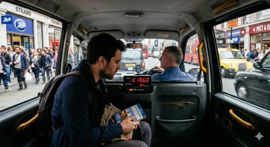 When the driver suggests a “special flat rate” that seems unusually high, the traveler politely declines and waits for the next licensed taxi.